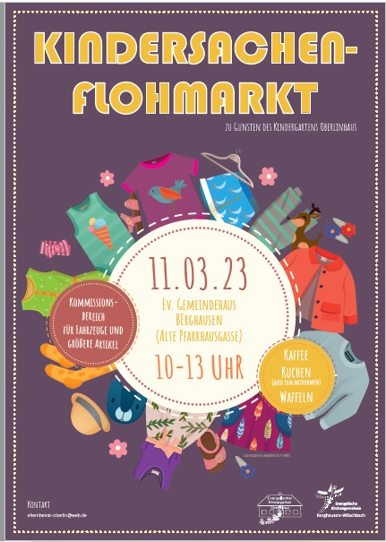 Kindersachen Flohmarkt mit Kommissionsbereich des Kindergarten Oberlinhaus am Samstag, 11. März 2023, 10:00 bis 13:00 Uhr, im ev. Gemeindehaus Berghausen. Eintritt frei. Außerdem Verkauf von Kuchen, Waffeln und Getränken zugunsten des Kindergarten Oberlinhaus.