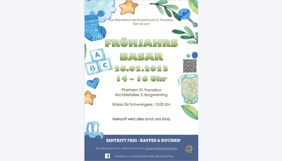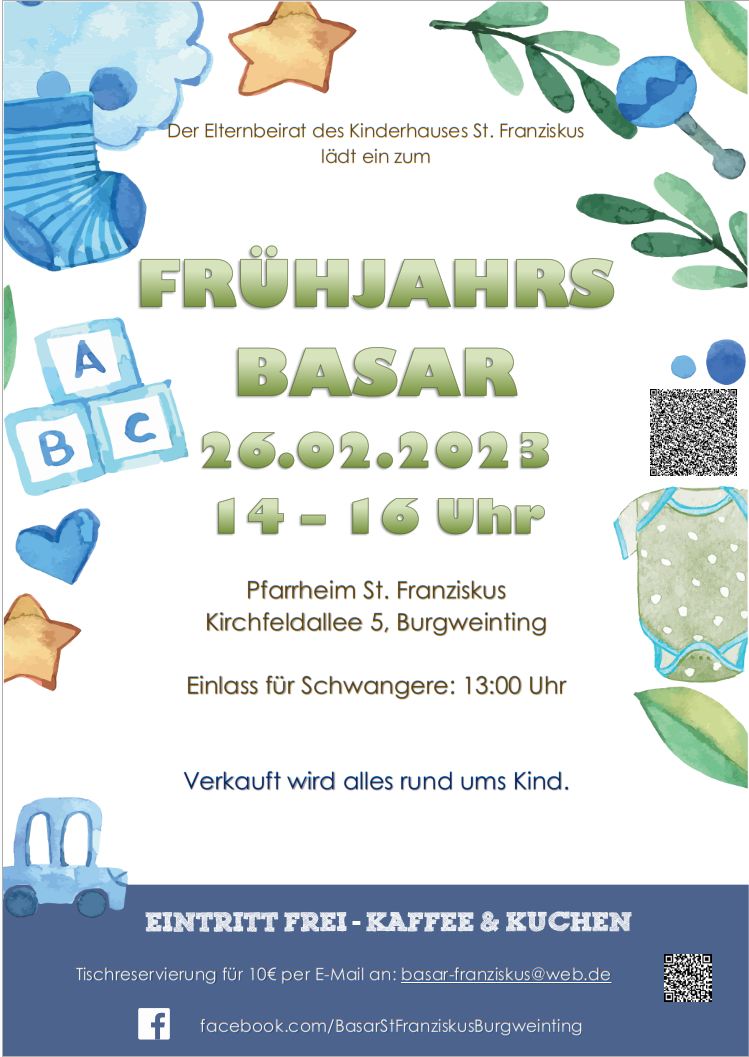 Am Sonntag, den 26. Februar 2023 von 14:00 bis 16:00 Uhr (für Schwangere Einlass ab 13:00 Uhr) findet im Pfarrheim St. Franziskus, Kirchfeldallee 5 in 93055 Regensburg (Burgweinting) der Basar vom Elternbeirat des Kinderhauses St. Franziskus statt.