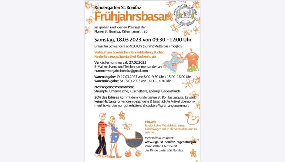 20 % des Erloeses kommt dem Kindergarten St. Bonifaz zugute. Es wird keine Haftung fuer verloren gegangene und beschaedigte Artikel uebernommen! Es werden nur gut erhaltene und saubere Waren angenommen.