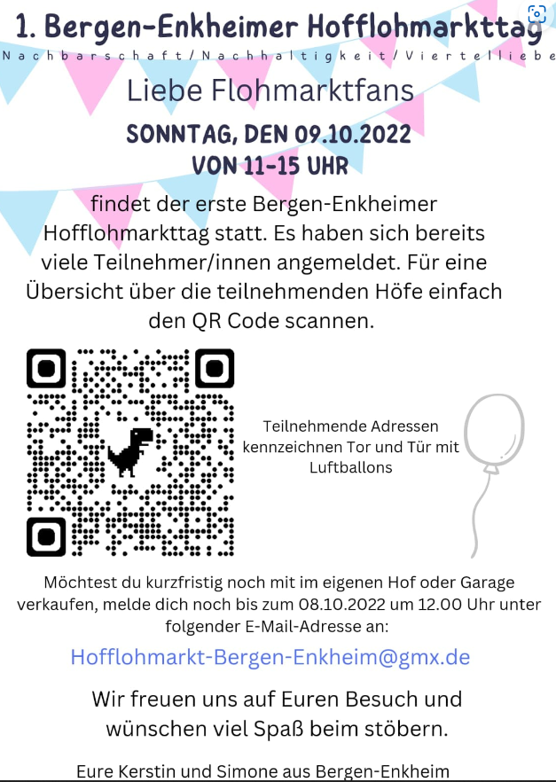 Moechtest du kursfristig noch mit im eigenen Hof oder Garage verkaufen, melde dich noch bis zum 08.10.2022 um 12 Uhr unter folgender e-Mail Adresse an : hofflohmarkt-bergen-enkheim@gmx.de