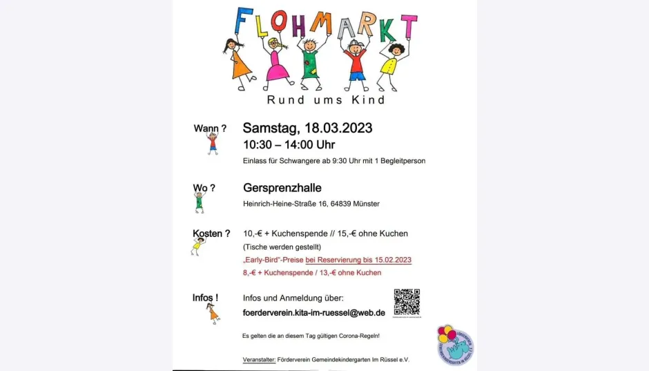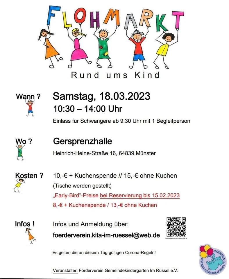 Der Förderverein der Kita Im Rüssel veranstaltet zum 1. mal einen Flohmarkt „Rund ums Kind“ am 18.03.2023 ab 10:00 (Einlass für Schwangere + 1 Begleitperson ab 09:30) in der Gersprenzhalle in Münster.